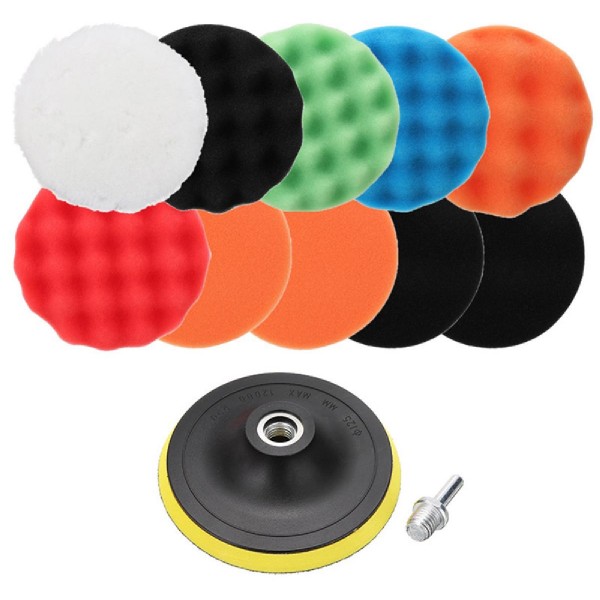 Σετ γυαλίσματος αυτοκίνητου που αποτελείται από 9 σφουγγάρια γυαλίσματος με διαφορετική σκληρότητα και δομή, 1 γούνα γυαλίσματος, 1 κεφαλή και 1 αντάπτορα M14 με στέλεχος 8 mm.